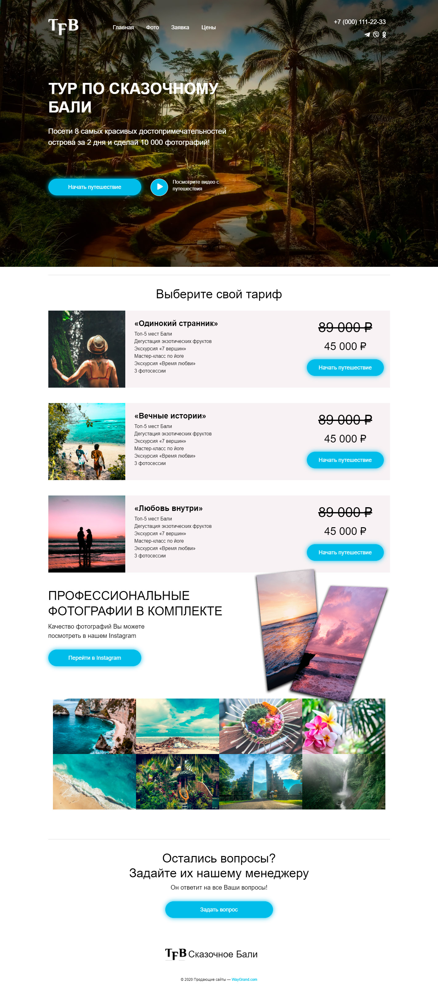 - Промоблок "Тур по сказочному Бали" с кнопкой призыва к действию "Начать путешествие"